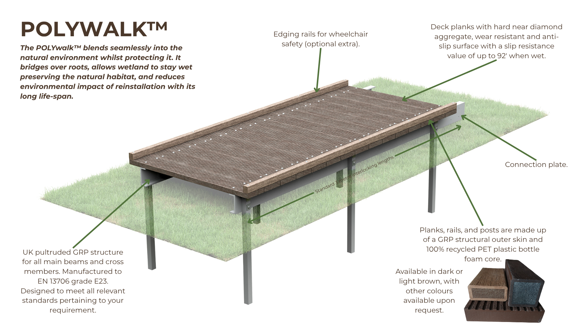 A range of walkway plank finishes and colours to suit the natural environment.